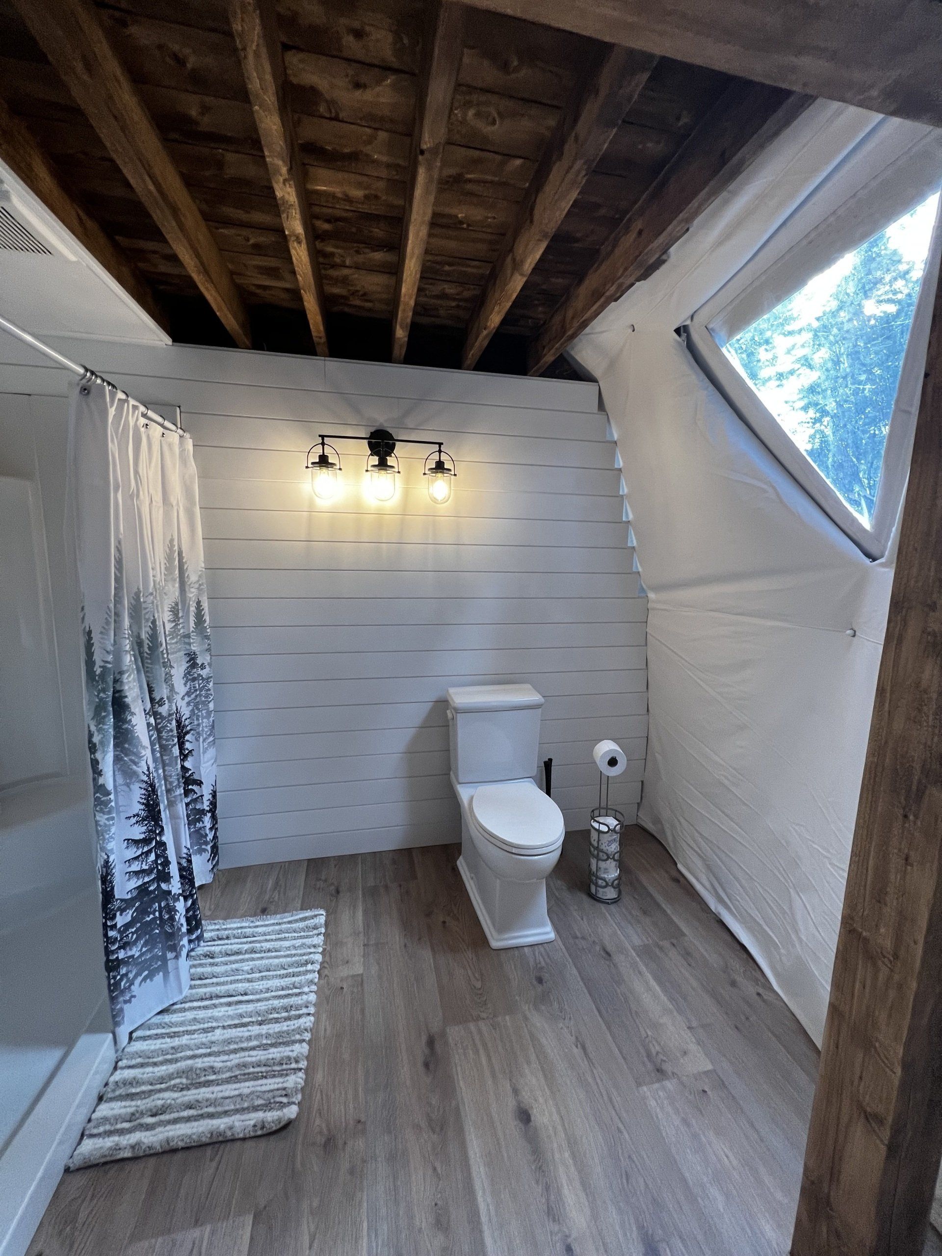 This dome has recently undergone a renovation to make this dome accessible for those with accessibility needs to be able to enjoy. The Timberland is complete with a large washroom / with accessible shower, double pull out sofa bed on the main level, kitchenette, and eating space. In the loft there is 1 Queen bed. This amazing space is complete with all the supplies you need, all you need to bring is your food, drinks and personal things. This dome also has a HOT TUB.